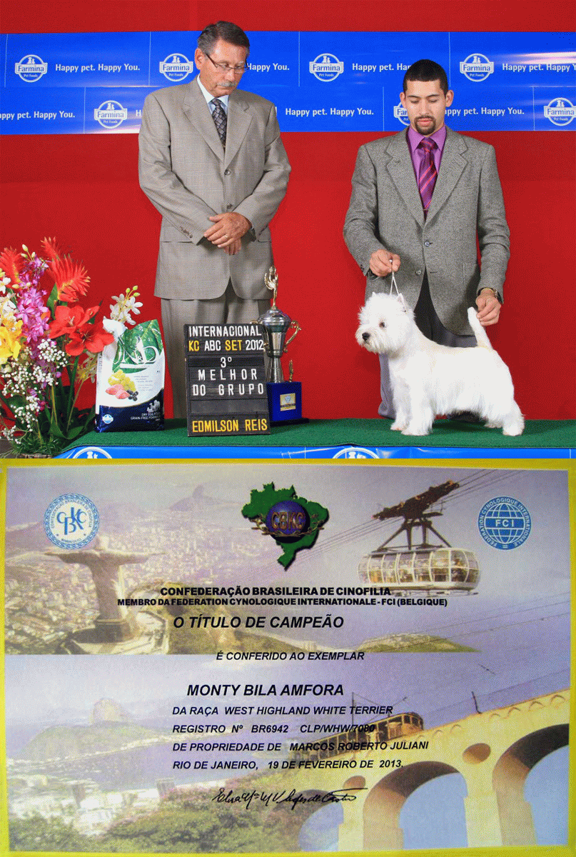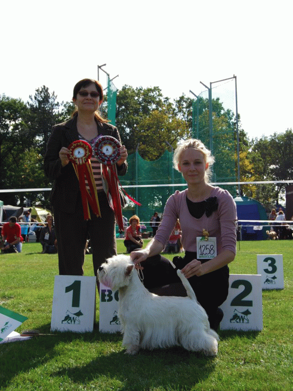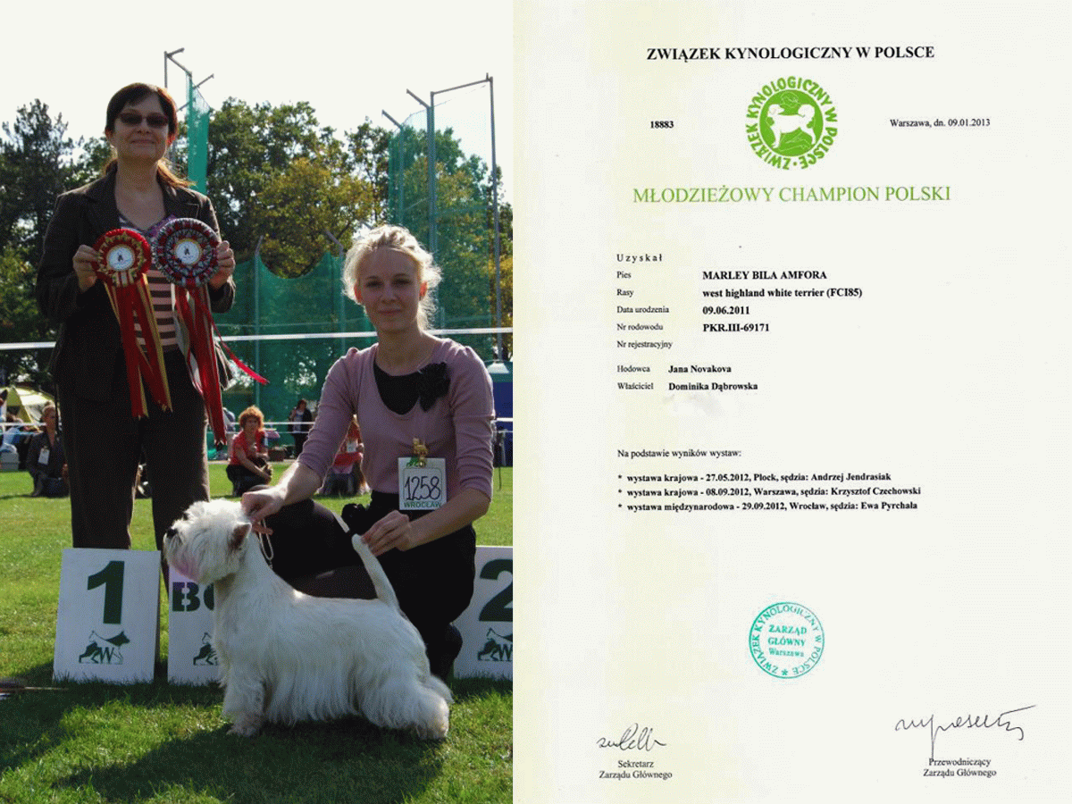 * 29.9.2012 - Mezinárodní výstava psů CACIB Wroclaw (PL), rozhodčí: Ewa Pyrchala (PL) Marley Bílá Amfora (Ice) - třída mladých: výborný 1, CAJC, nejlepší junior, BOB!!! majitel: Dominika Dabrowska(PL) - bravo!!!