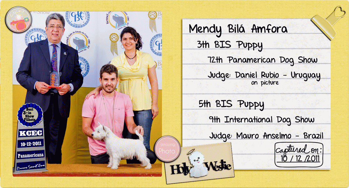 * 6-měsíční Mendy má za sebou první výstavní úspěchy v Brazílii ve třídě štěňat. Gratulujeme majitelům Andréia a André a děkujeme za péči o Mendy a její prezentaci!