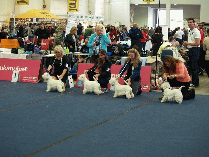 * 6.8.2011 Národní výstava psů Saariärvi (Finsko) Ivet Bílá Amfora - BOB, CAC a stává se novým šampionem Finska a její bratr Ionash Bílá Amfora - BOS gratulace Minna a Birgit!